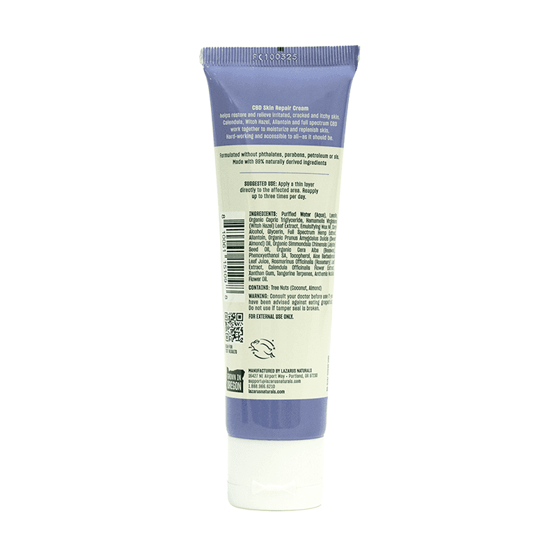 Purified Water (Aqua), Lanolin, Organic Capric Triglyceride, Hamamelis Virginiana (Witch Hazel) Leaf Extract, Emulsifying Wax NF, Cetyl Alcohol, Glycerin, Full Spectrum Hemp Extract, Allantoin, Organic Prunus Amygdalus Dulcis (Sweet Almond) Oil, Organic Simmondsia Chinensis (Jojoba) Seed Oil, Organic Cera Alba (Beeswax), Phenoxyethanol SA, Tocopherol, Aloe Barbadensis Leaf Juice, Rosmarinus Officinalis (Rosemary) Leaf Extract, Calendula Officinalis Flower Extract, Xanthan Gum, Organic Citrus Sinensis (Orange) Peel Oil Expressed, Anthemis Nobilis Flower Oil. CONTAINS: Tree Nuts (Coconut, Almond).